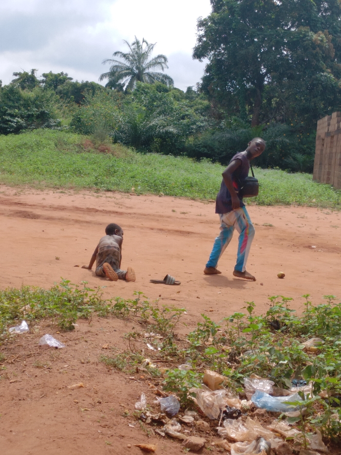 An outdoor scene in Ejule, Nigeria, depicts an unpaved, reddish-brown dirt path under an overcast sky. In the foreground, scattered litter, primarily plastic bags and wrappers, is visible amidst sparse green vegetation. Two individuals are present. To the left, a child is seated on the dirt, facing away from the viewer, wearing patterned light brown trousers and a dark shirt. Their feet are covered in brown shoes or sandals. A single black slide sandal rests on the ground near this individual. To the right, an older male individual walks to the right, turning his head to face the camera. He wears a dark blue/purple short-sleeved shirt, patterned trousers with blue, pink, and white designs, and a dark shoulder bag. He is barefoot. A small, round, light-colored object lies on the ground near his right foot. The background features dense green foliage, including a prominent palm tree, against the cloudy sky. A partial view of a light-colored, possibly unfinished block wall structure is visible on the far right in the mid-ground.