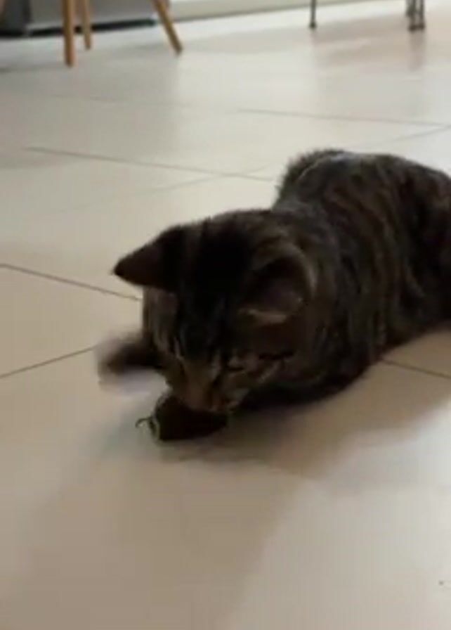 - "A tabby cat lies on a white tiled floor, playing with a small, green elastic band" by FM-CYJaF3, licensed under CC BY 4.0