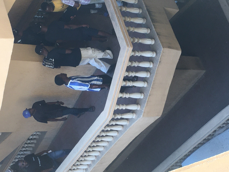 The scene depicts a group of seven individuals walking along a sunlit, beige-walled corridor within a building in Shaba, Nigeria. A prominent feature is a beige concrete balustrade railing with white, turned balusters forming an interior corner or bend in the pathway. Below this railing, a dark, level surface is visible. From left to right: 1. A male in a black t-shirt with a white logo, blue jeans, and a blue New York Yankees baseball cap, walking in dark sandals. 2. A male in a blue and white vertically striped short-sleeved shirt and dark pants, seen in profile facing right. The shirt resembles an Argentina national football team jersey. 3. A male in a black t-shirt and loose-fitting light beige cargo pants, wearing dark shoes. He carries a multi-compartment black and white bag on his back via shoulder straps. 4. A male in a black t-shirt and dark shorts. 5. Three additional individuals are partially visible further down the corridor to the right, one wearing a yellow shirt and another a light-colored plaid shirt. All individuals appear to be walking in the same general direction, from left to right, along the corridor. The environment is well-lit by natural light.