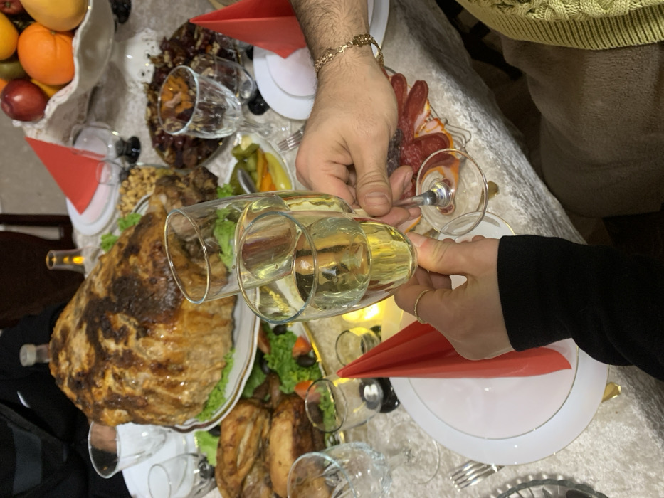 A table overflowing with food: a large roasted piece of meat, fruits in a bowl, assorted appetizers, and cooked chicken pieces. Two people's hands are visible, one wearing a gold bracelet, toasting with wine-filled glasses. Red napkins are present on plates. The tabletop is covered with a patterned tablecloth and other glassware.