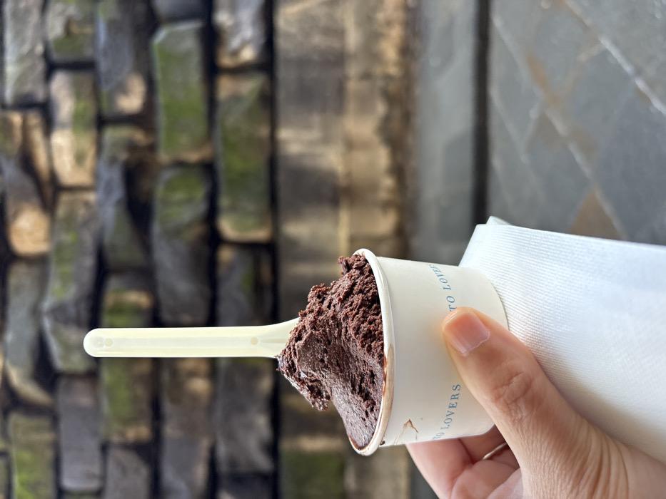 A human hand, identified as belonging to an adult, holds a small white paper cup containing dark brown gelato, likely chocolate, topped with a light yellow plastic spoon