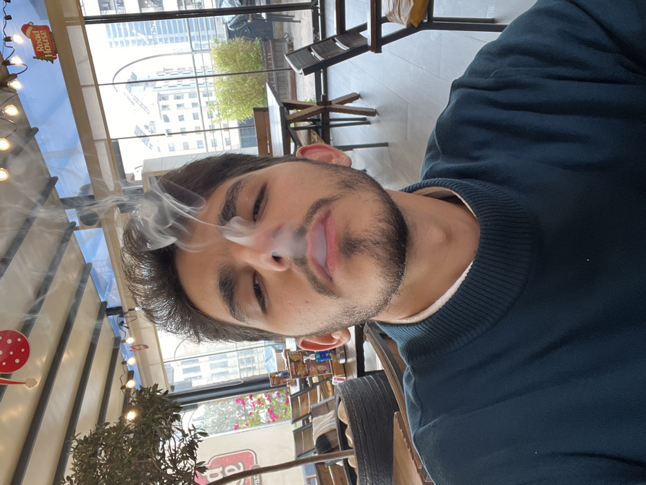 - "A young adult male, with dark hair and a short beard, is depicted in a close-up shot, exhaling a visible plume of smoke directly upwards from his mouth while looking towards the viewer" by FM-WnN6r1, licensed under CC BY 4.0
