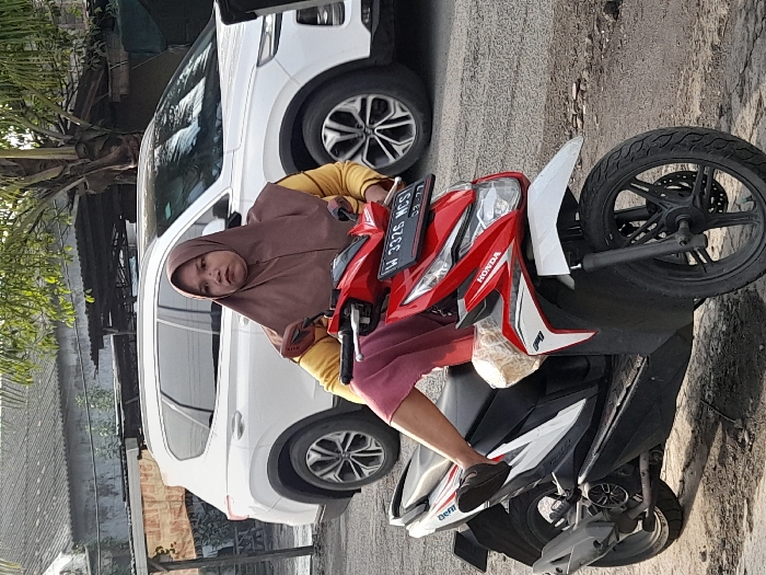 A woman wearing a brown hijab sits on a red and white Honda motorcycle. The motorcycle has a license plate that reads "M 3325 NCS". The woman is wearing a yellow shirt and pink pants, with black shoes. A white SUV is parked behind her. The background appears to be a street or parking area with buildings and trees.