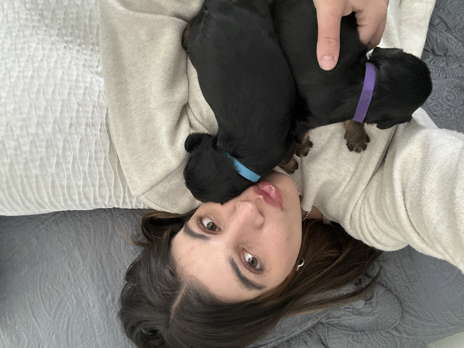 - "A woman with brown hair and light skin lies on a bed with two black puppies" by FM-OKeT52, licensed under CC BY 4.0