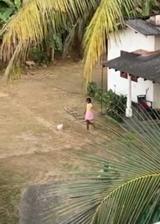 The scene depicts a young girl in a pink dress playing with a white cat on a grassy lawn. The environment features lush greenery, including palm trees, suggesting a tropical or subtropical location. A small white house with a dark roof is visible in the background. The girl attempts to pick up the cat, succeeding on the second attempt. She then runs with the cat in her arms, seemingly in a playful manner. A ladder lies on the ground near where the girl and cat are playing. The video is shot from an elevated viewpoint, possibly from a rooftop or higher floor, with palm leaves partially obscuring the view.