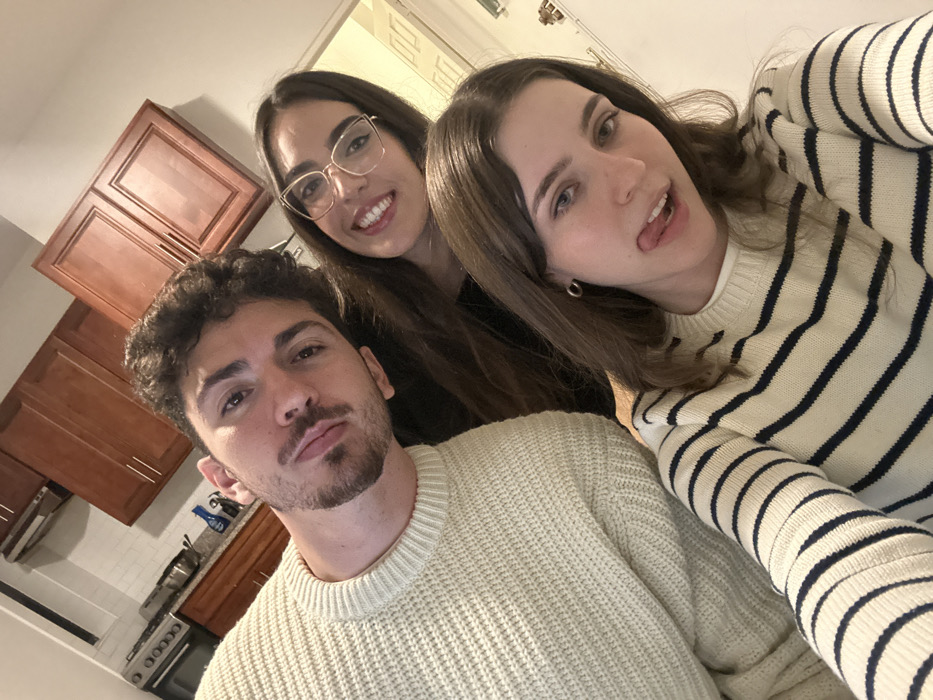 The image depicts three individuals in a group selfie within a residential kitchen