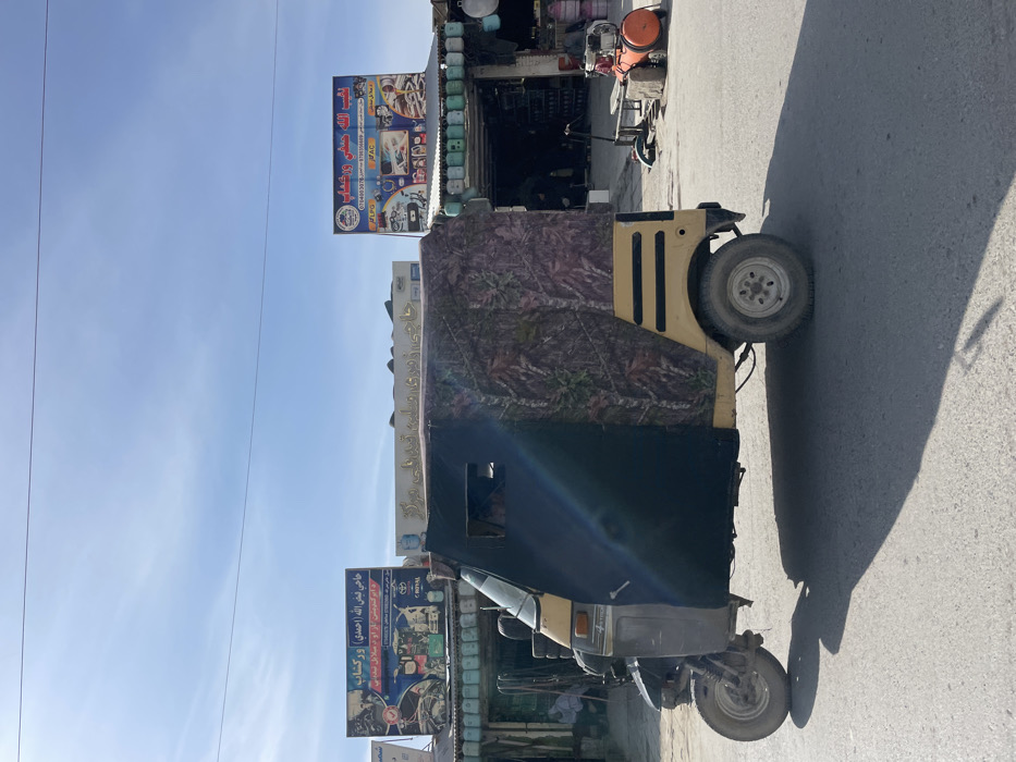 - "A motorized rickshaw, painted tan and covered in camouflage fabric and black canvas, sits on a paved road beside storefronts" by FM-LYje72, licensed under CC BY 4.0