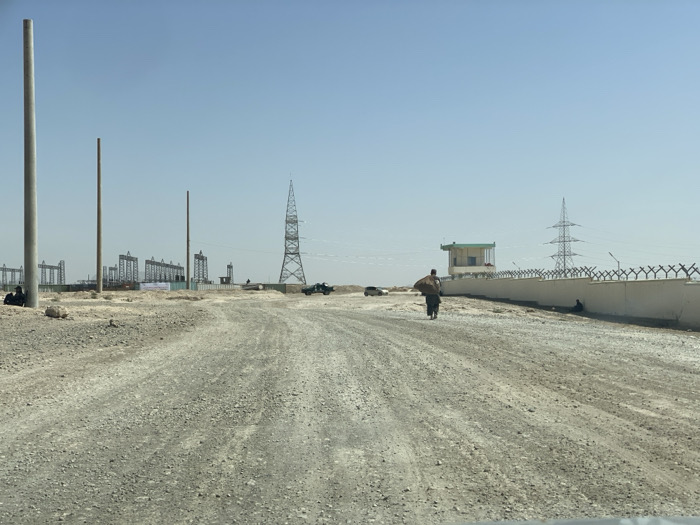 dirt road in Pir Dust, Afghanistan, at coordinates 31.629, 65.853. A single man walks along the road towards the camera. The road is flanked by a white wall topped with razor wire. Beyond the wall is a power substation with several power lines and towers. The man is wearing traditional clothing, a long brown robe and a turban. He is carrying a brown bag or basket on his back. The sky is clear and blue. The ground is sandy and dry. There is another person sitting in the distance by the wall, wearing a dark shirt, and possibly pants. A vehicle is also visible in the distance. A small, green-roofed building is seen behind the wall. The scene is typical of a rural area of Afghanistan.