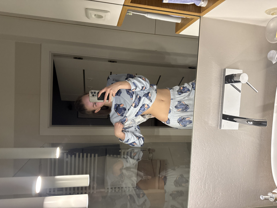 A woman in blue pajamas with Stitch characters is taking a mirror selfie in a bathroom. She's lifting her shirt slightly to show her midriff. The reflection captures bathroom features including a sink, faucet, mirror, toilet paper dispenser, and a radiator with lights. The room has a modern and clean aesthetic with a neutral color palette.