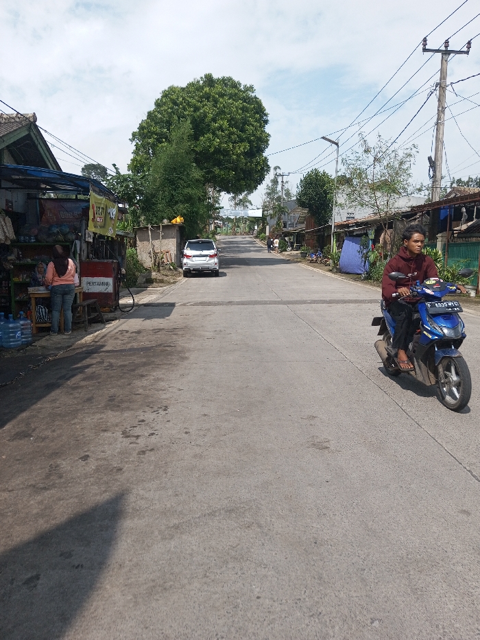 This image depicts a scene in the city of Sandamal Eliya, Sri Lanka, centered on a paved road under a bright, partially cloudy sky. Sunlight casts distinct shadows on the ground, suggesting a midday timeframe. On the left side of the foreground, an informal roadside stall is visible. This stall features a red 'PERTAMINA' branded fuel dispenser with a black hose extending from it, positioned adjacent to several large blue bottled water containers. A person, appearing female, with dark hair, dressed in a light pink hoodie and blue jeans, stands facing away from the camera, interacting with the stall. Further down the road on the left, a silver multi-purpose vehicle is parked, facing away from the viewer. A large, dense green tree is prominent on the left mid-ground. On the right side of the foreground, a young male subject, wearing a dark red hoodie, dark trousers, and sandals, operates a blue scooter towards the viewer. The scooter displays a license plate 'F 6039 TYC' with a '04-25' date. The right side of the road is lined with wooden utility poles supporting numerous overhead electrical and communication wires, along with a street light. Various simple structures, some partially covered with blue tarpaulins, are visible along this side. In the background, the paved road continues, and several distant human figures are visible walking on it.