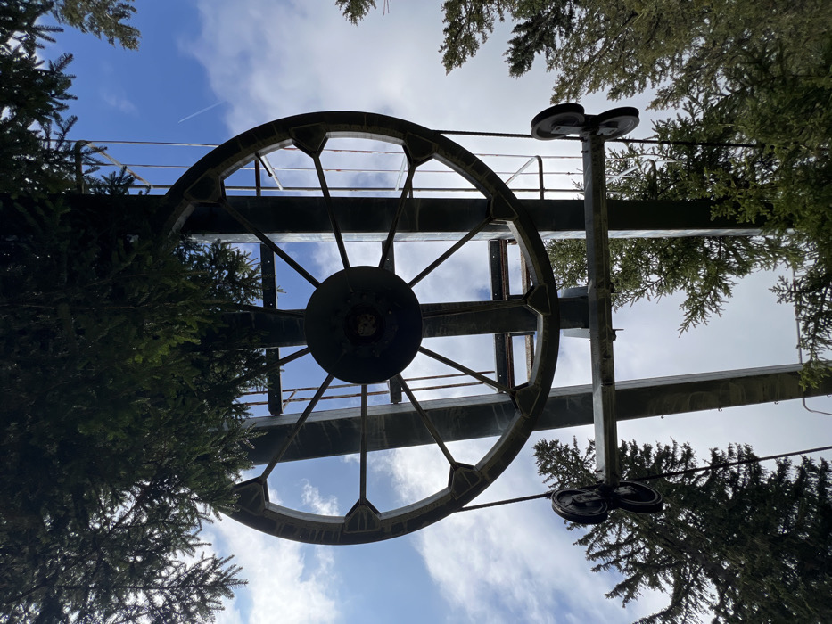 The image provides an upward view of a metallic ski lift or cable car pylon structure, situated in Pitomine, Montenegro. A prominent, large dark gray spoked wheel, part of the cable transport mechanism, dominates the central frame, set against a partially cloudy blue sky. This wheel displays a central hub and radial spokes connecting to a polygonal outer rim. Below the main wheel, a pair of smaller dark gray pulley wheels is visible, indicating the trajectory of a cable. The metallic components exhibit signs of weathering. Dense green evergreen trees, likely conifers, frame the structure from the top, bottom, and sides, characteristic of a forested area. A faint white airplane contrail is present in the upper right sky. No people are visible, and the machinery appears static.