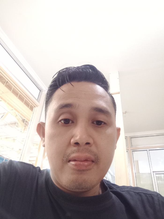 A medium shot depicts a man with dark hair styled upwards. He has an oval face, dark eyes, a broad nose, and a thin mustache and goatee. He wears a black shirt. The background features a bright room with a large window on the left and a door with a glass pane on the right. The ceiling is white and illuminated. The photo appears to be taken from a low angle, slightly above the man.