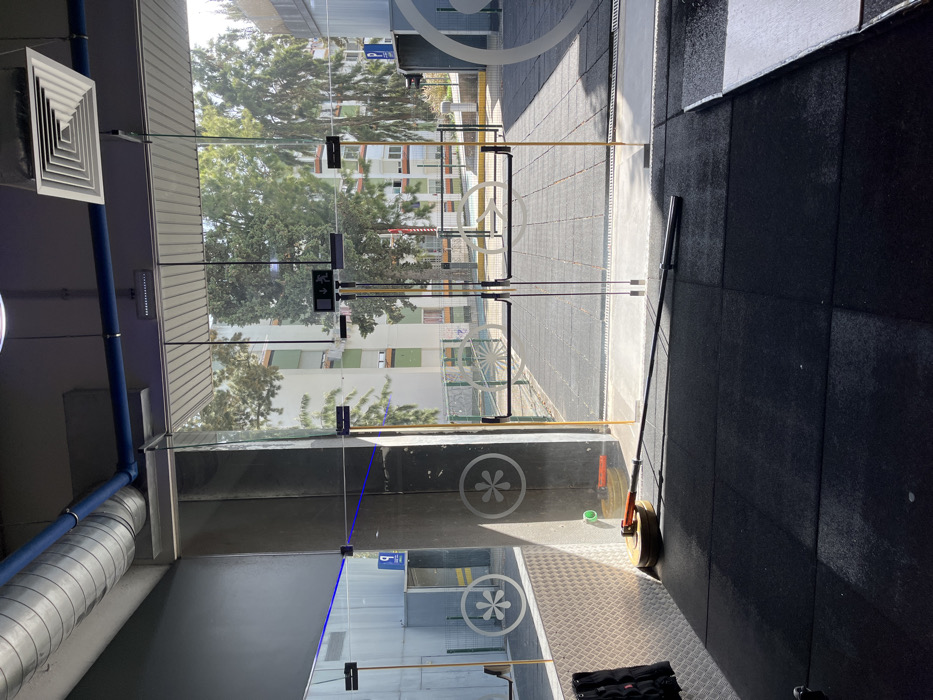 - "The image presents an interior perspective looking outward through a transparent glass wall and double doors, characteristic of a fitness facility located in Oeiras, Portugal" by FM-XmQCg2, licensed under CC BY 4.0