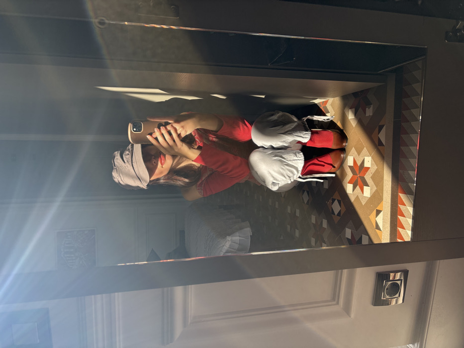 A person is reflected in a large mirror, crouching on a geometrically patterned tiled floor
