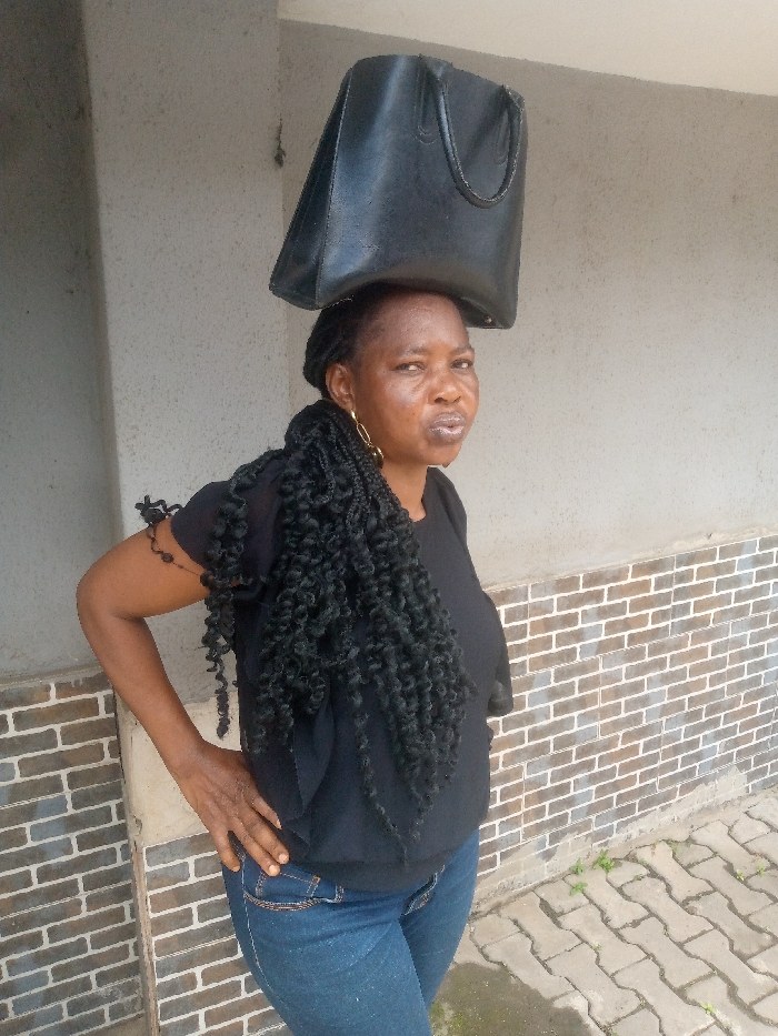 An adult female is depicted standing in a semi-outdoor setting in Iranla, Nigeria. She is balancing a black, rectangular handbag, equipped with two top handles, on her head. The woman has a medium-brown skin tone, with long, dark, braided hair styled with a curly texture, extending past her left shoulder. She is dressed in a black short-sleeved top and blue denim jeans. A single gold-colored hoop earring is visible on her left ear, and a dark, possibly beaded, strand is draped over her left shoulder. Her left hand is placed on her hip, and her mouth is slightly pursed as she looks towards the viewer's left. The background features a light grey plastered wall in the upper section, transitioning to a lower band of brown and beige brick-patterned cladding. The ground is paved with light grey interlocking concrete blocks, with sparse green vegetation visible in the crevices.
