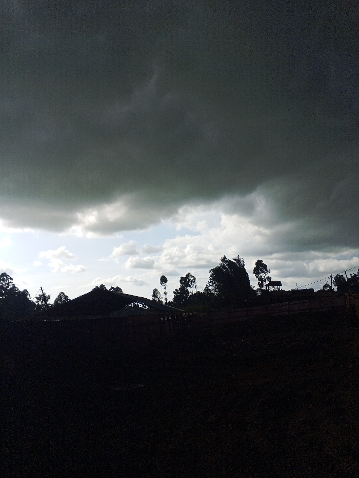 The image displays a rural landscape under heavily overcast conditions in Borabu Chitago ward, Kenya. The upper portion of the frame is dominated by expansive, dark grey, dense cloud formations. A small, irregular patch of lighter sky, containing both blue and white cumulus clouds, is visible above the horizon in the left-central area. The foreground and lower half of the image are severely underexposed, appearing as an undifferentiated, dark mass, consistent with land or vegetation in deep shadow. Across the mid-ground horizon, various features are discernible in silhouette. Multiple tall, slender trees with dense crowns are present, particularly on the left and right edges, and extending along the horizon line. A structure with a dark, gabled or sloped roof, possibly constructed of corrugated material, is visible on the left side of the mid-ground. Towards the right, a smaller, elevated, open-sided structure resembling a gazebo or small observation point is discernible on a slight rise. A dark, linear element, consistent with a fence or boundary, extends horizontally across the mid-ground, separating the dark foreground from the more distant silhouetted features. No individuals, specific actions, or interactions are visible within the scene. The overall lighting suggests an impending storm or heavily clouded atmospheric conditions.