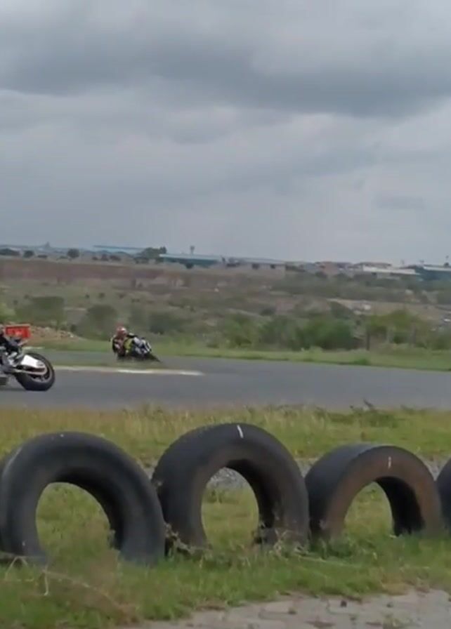 motorcycle racing on a track. The motorcyclist is wearing a helmet and protective gear. The motorcycle is leaning into a turn, tires and sky visible. The race track is surrounded by grass and a row of tires that act as a barrier. In the background, there is a cityscape visible under an overcast sky. Another motorcycle is slightly ahead in the turn.