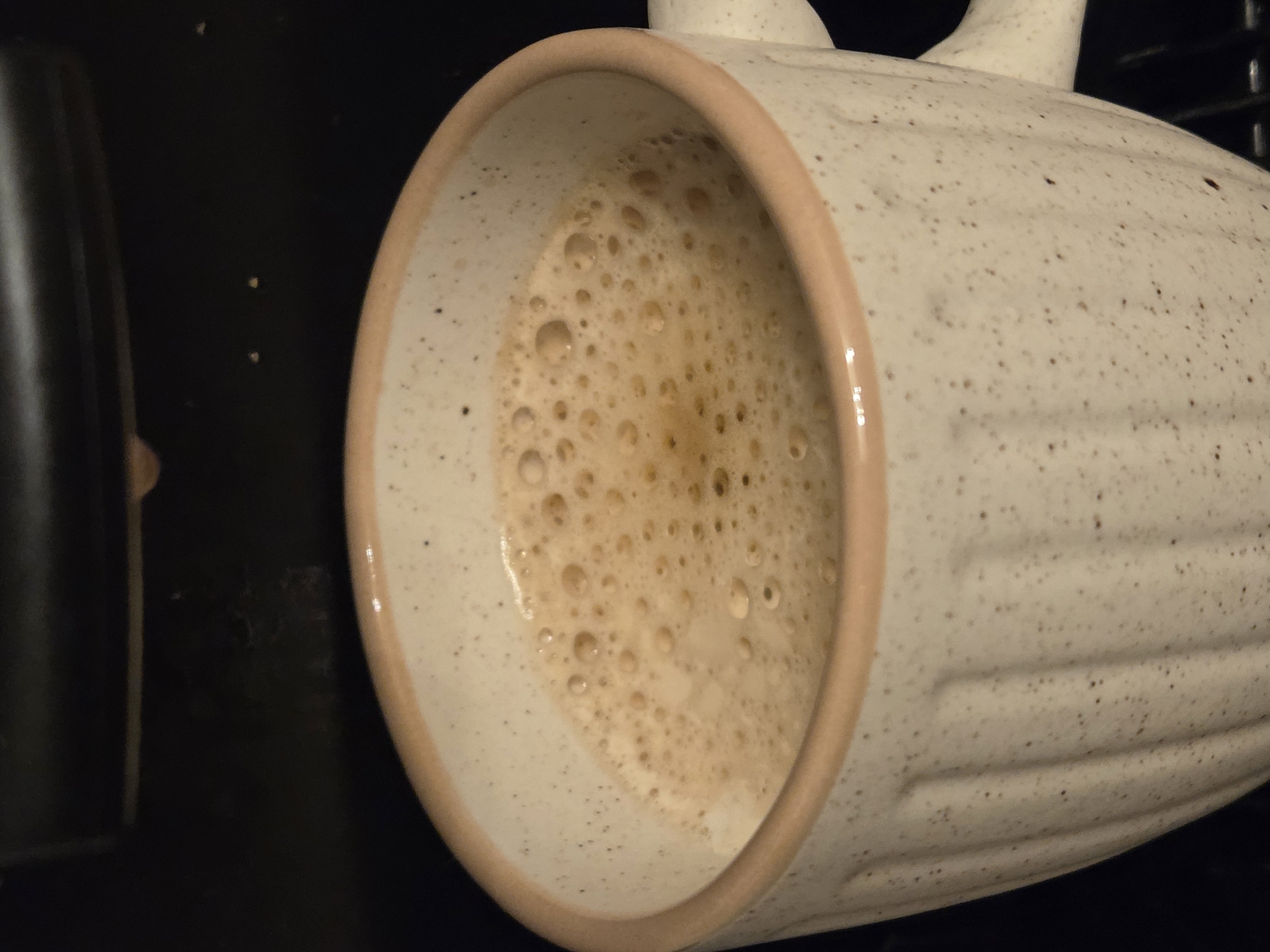 A close-up shot depicts a ceramic mug filled with a bubbly, light brown liquid, likely a coffee-based beverage. The mug has a light beige color with small dark speckles and a ridged texture on its exterior. The rim of the mug is lined with a smooth, tan-colored band. The mug is positioned at an angle, with the interior facing upward and slightly to the left. To the left of the mug, there's a blurred, dark object. The background is black. There's no information to suggest this photo was taken in Varna, Bulgaria, or any indication of people, interactions, or the environment.