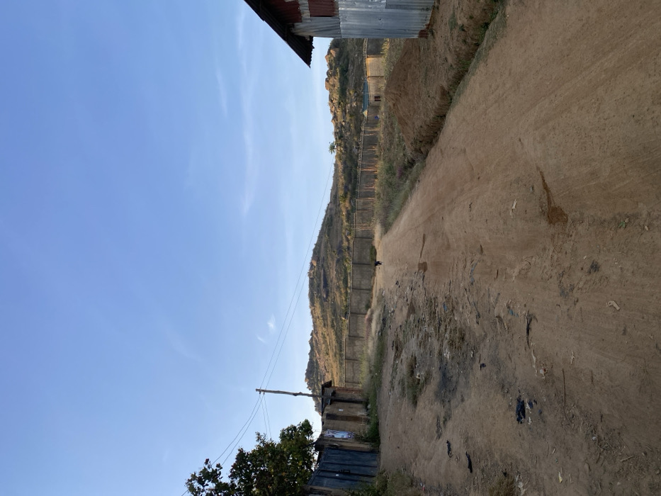 An unpaved, reddish-brown dirt road extends into the distance under a clear blue sky, characteristic of an area within or on the outskirts of Jos, Nigeria. The road exhibits tire tracks and scattered dark debris, particularly on the left. A small, dark animal, likely a dog, is visible walking in the middle of the road in the mid-ground. On the immediate left, a tall, dark blue metal gate is positioned next to a structure composed of concrete blocks and corrugated metal. A wooden utility pole with power lines spans overhead, partially obscured by green foliage in the upper left corner. On the right, a building constructed with a corrugated metal roof and siding shows signs of rust and wear. Adjacent to this structure, a mound of excavated reddish-brown earth sits next to a trench. Further along the right, a substantial concrete wall, topped with what appears to be barbed wire, runs horizontally, forming a perimeter. Beyond this wall, the landscape features sparse, dry vegetation leading to prominent, sunlit rocky hills in the background. The overall lighting suggests either early morning or late afternoon.