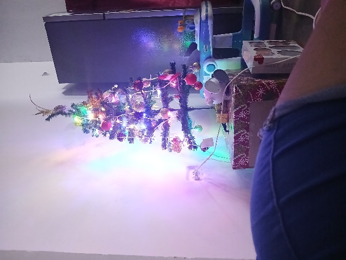 A lit Christmas tree sits near gifts and a child's walker. The tree is adorned with ornaments and colorful lights. Behind the tree, a gray object is visible. The background is a light-colored wall. A portion of a person wearing blue clothing is visible in the foreground.