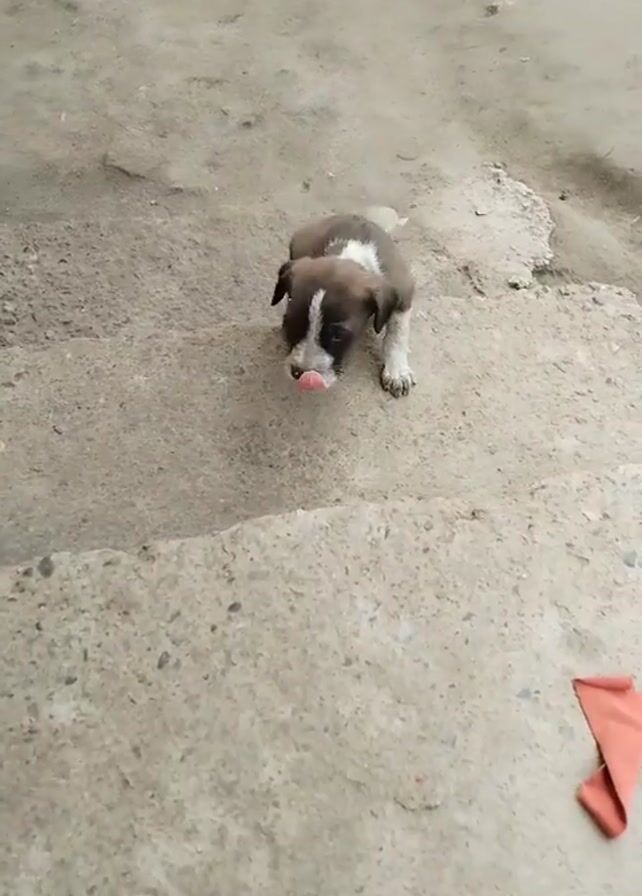 small puppy standing on a concrete surface. The puppy has dark brown fur with white markings on its face and chest. It is looking down, occasionally licking its nose. An orange piece of fabric lies on the concrete surface. The background is a plain concrete area with some dirt and debris. The puppy appears to be exploring its surroundings.