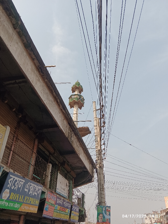 The image depicts an upward-angled view of a street scene in Kaliganj, Bangladesh, under a bright, hazy sky. On the left, the weathered concrete facade of a commercial building is visible. This structure features multiple storefronts with rolled-down metal shutters and security grilles. Prominently displayed is a blue sign in Bengali and English reading "ROYAL EXPRESS," with additional Bengali text indicating routes like "Kaliganj-Dhaka-Chittagong" and a phone number. A second partially visible sign reads "জননী পরিবহন" (Jononi Poribohon). Behind the building's facade and slightly to the right, a white minaret with a distinct green and white tiered, decorative top section rises. To the right of the minaret and extending towards the right edge of the frame, a robust concrete utility pole stands, laden with a dense array of black electrical and communication wires fanning out across the sky. A green and white political poster, depicting two male figures, is affixed to the lower section of this utility pole. A digital timestamp "04/12/2023 14:07" is present in the lower right corner. No specific individuals or direct actions are discernible within the frame.
