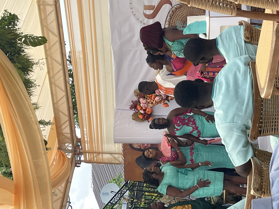 An outdoor event is depicted under a large, light orange-draped canopy supported by a metal truss structure, adorned with green foliage. The scene is set in Kumasi, Ghana. A white backdrop features the partial text "MON AND EL" and a prominent "S" logo, flanked by a large portrait of a smiling woman on the left and a floral and dried palm leaf arrangement on the right. Approximately ten individuals are visible. In the mid-ground, a central group consists of a man in white and orange traditional attire interacting with six women. Most of these women wear matching light turquoise-colored dresses or outfits; one woman holds a pink fan, another displays intricate pink embroidery on her attire. A woman with deep red hair in a turquoise top stands to the right, and another in an orange patterned top is positioned between the man in traditional attire and the red-haired woman. A man in a green and yellow garment is partially visible on the far left. In the foreground, two men, seen from behind, are seated in wicker chairs, both wearing matching light turquoise long-sleeved shirts, observing the central group. To the right of the main group, a small white cake with turquoise frosting details rests on a white pedestal table, beside a large woven circular decorative piece. A satellite dish is visible on the roofline of an adjacent building in the background. The overall environment suggests a daytime celebration or gathering in an open, covered space.