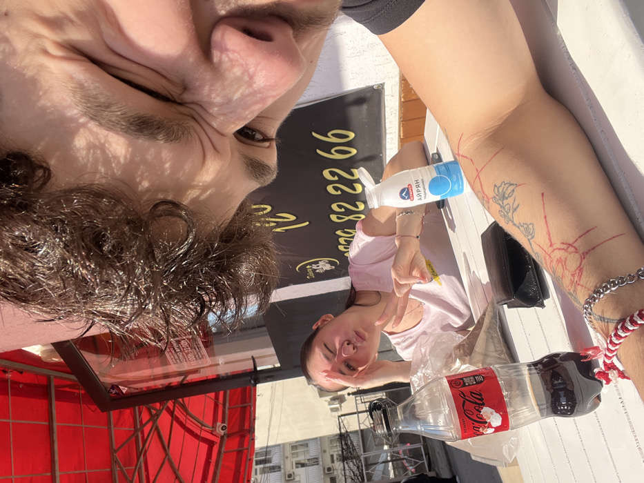 The scene depicts two individuals seated at an outdoor white slatted table under a red awning on a sunny day in Sandanski, Bulgaria. In the immediate foreground, the top right quadrant captures a male's upper face, exhibiting dark, curly hair, a visible right eye, and creased skin around the eye. His right forearm rests on the table, featuring a tattoo with floral elements and red linear markings, a silver chain bracelet, and a red and white woven bracelet. Opposite, a female is seated, wearing a light pink t-shirt with a "Choice" graphic. She is making a "duck face" expression, winking her left eye, and performing a peace sign gesture with her right hand, while her left hand supports her head. On the table are a half-empty 0.5L plastic Coca-Cola bottle, a plastic bag, a black wallet, and an open white plastic bottle of Olympus Ayran. The background reveals a black sign with yellow text including numbers "120" and "0879 82 22 66", residential buildings, and a visible CCTV camera attached to the awning structure.