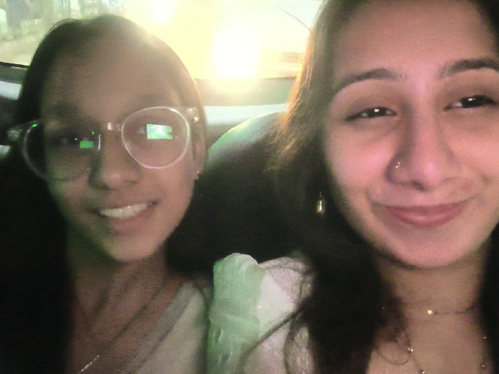 Two young women pose closely, illuminated by an overhead light. The woman on the left wears round, transparent glasses and a necklace. The woman on the right has a nose piercing and multiple delicate necklaces. Their facial expressions suggest a relaxed, happy mood. They appear to be seated in a vehicle, indicated by the interior setting. The overall image quality is slightly grainy, possibly taken in low light.