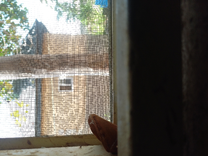 This image presents a low-angle outdoor view in Karmajiji, Nigeria, observed through a window equipped with a fine-mesh insect screen