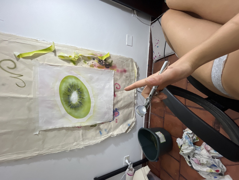 The image displays an indoor artistic workspace. A light-colored fabric sheet, stained with various paint marks and featuring a faint green "N" graphic, is affixed to a white wall, serving as a backdrop. Centered on this fabric is a piece of white paper with a hyperrealistic airbrush painting of a green kiwi fruit slice. Yellow tape strips are visible on the right side of the fabric. The floor, composed of terracotta-colored tiles, features a dark green plastic bucket with liquid, and a pile of paint-stained white cloths to the left. A person is seated, with only their right arm, hand, and upper thighs visible in the foreground. Their right hand holds a silver airbrush tool, pointed upwards, with the index finger extended. The person wears light gray undergarments. A patterned floor mat with paint splatters is visible beneath the person's legs on the right side of the frame. The precise location within Buenos Aires, Argentina, cannot be determined from the depicted interior.