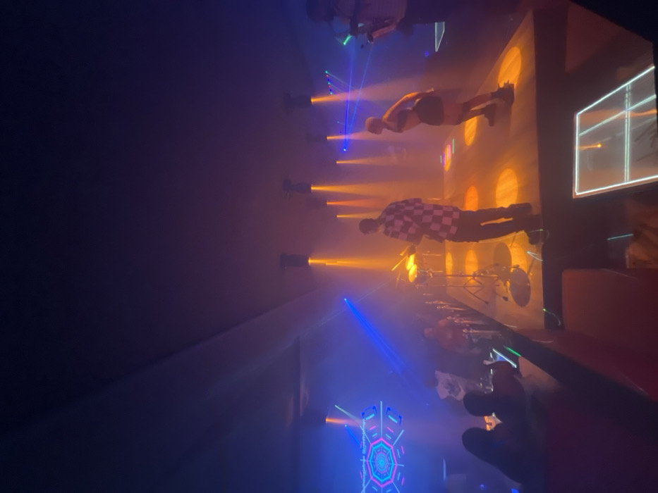A dimly lit venue displays a stage occupied by musicians and illuminated by spotlights. Figures are silhouetted against a wall decorated with large, circular patterns. A band is visible, complete with a drum set. Laser beams cut through the smoky atmosphere, creating a dynamic and vibrant ambiance. A geometric, neon-lit structure adds to the visual spectacle in the foreground. A screen is seen on the wall, perhaps displaying visuals for the performance.