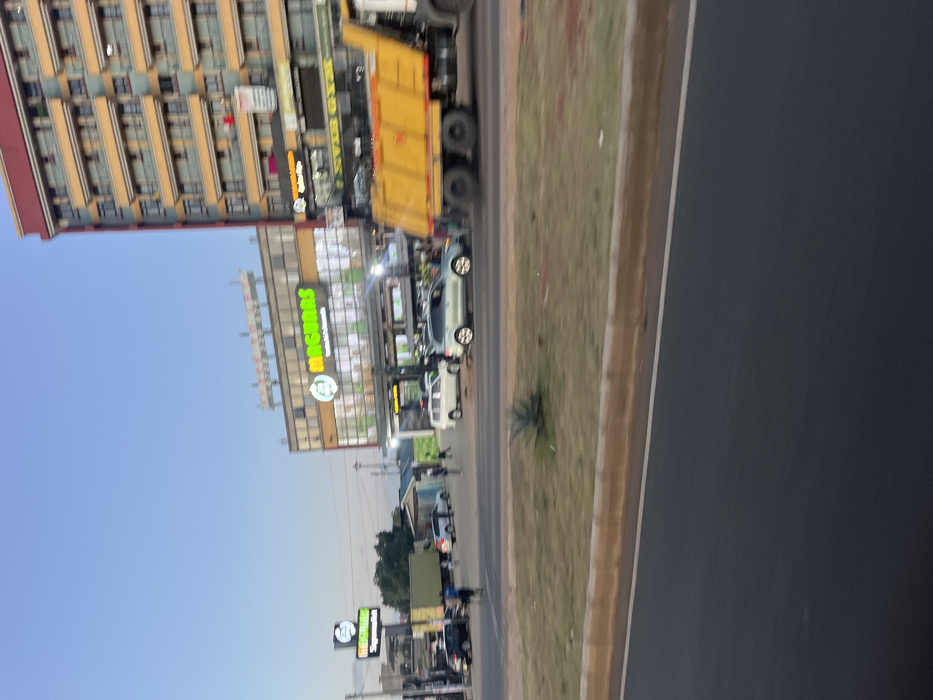 The image displays an urban street scene in Biashara ward, Kenya, during twilight hours, indicated by the transitioning light blue sky and activated artificial lights