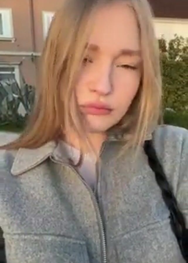 A fair-skinned woman with light-blonde hair poses for a selfie outdoors. She has light eyebrows and lips, and appears to be wearing clear lip gloss. She is wearing a light gray, short-zippered jacket over a white shirt. A black purse strap is visible over her left shoulder. She is looking into the camera and makes a pursed-lips face, and then touches her face with a manicured hand. In the background are buildings with windows and some shrubbery. The sky is partly cloudy. The light suggests it is late afternoon.