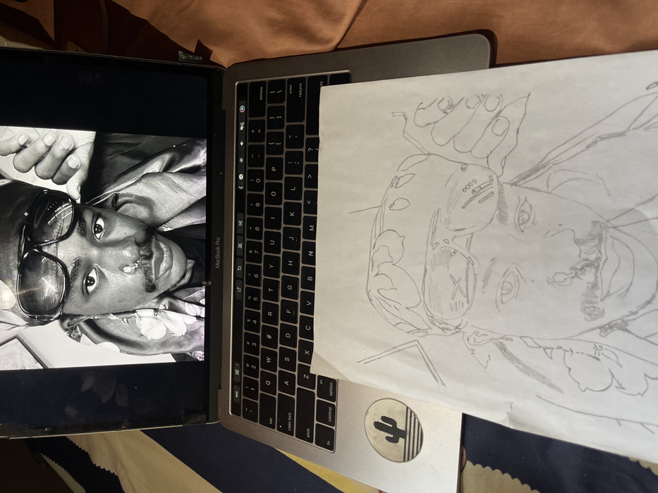 The image features a silver MacBook Pro laptop displaying a black and white portrait, with a corresponding pencil sketch on white paper positioned directly in front of it