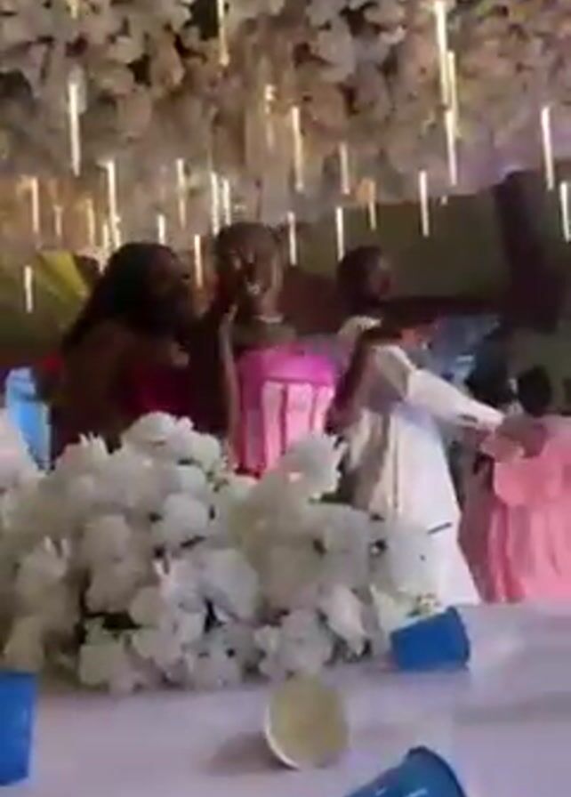 lively outdoor event with several people dancing near a decorated table. The table is adorned with large white floral arrangements, and there are scattered blue and yellow cups. A woman in a pink top and white skirt is dancing energetically, surrounded by other individuals. One woman is wearing a bright pink dress, and another is wearing a darker red outfit. The backdrop consists of lush green foliage and strings of lights. People appear to be enjoying themselves, clapping and moving to music. The overall atmosphere is festive and celebratory.