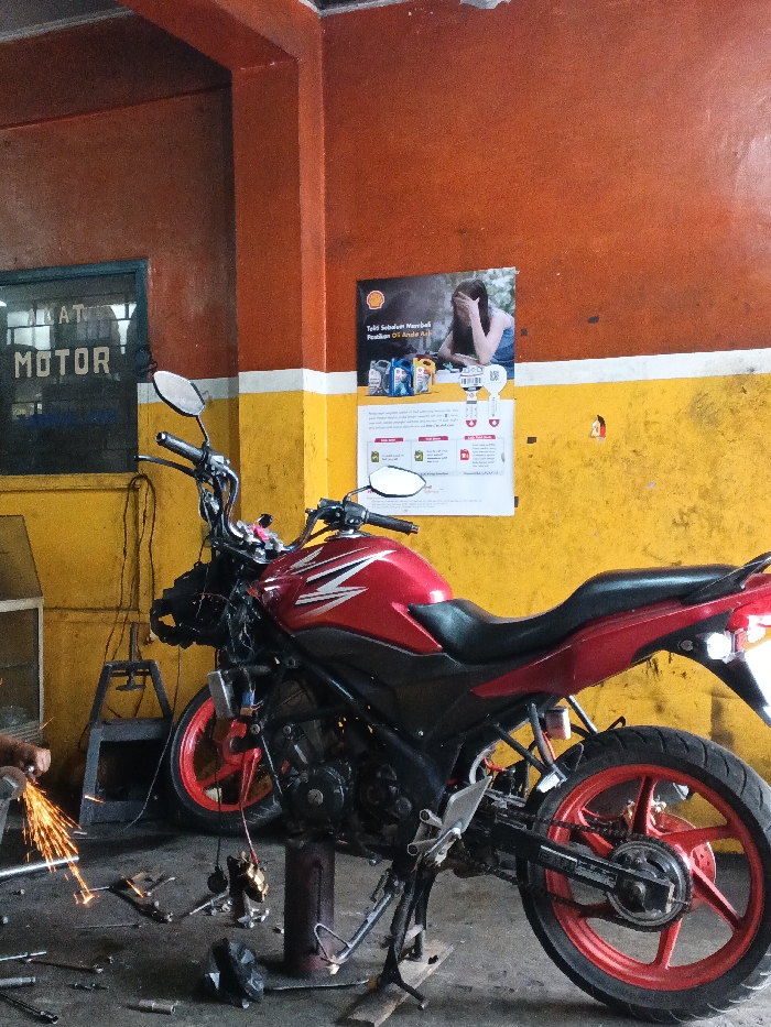 - "Inside a motor repair shop in Baturiti, Indonesia, a red and black motorcycle is positioned on a stand, undergoing maintenance or repair" by FM-avQGt2, licensed under CC BY 4.0
