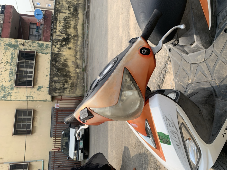 An orange and white Kymco 125cc scooter is parked on a paved surface, serving as the primary foreground subject in Alagbede, Nigeria