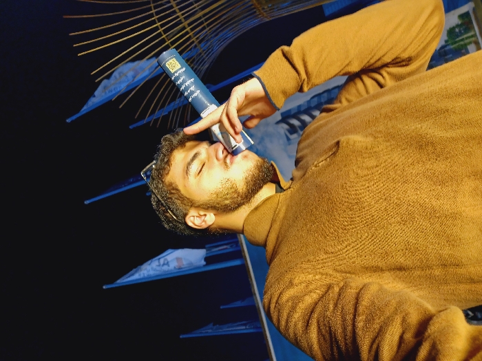 A low-angle, nighttime photograph depicts a young adult male in an outdoor setting in Shab'a, Syria. The subject, positioned centrally, has dark, curly hair, a beard, and wears a brown, textured long-sleeved sweater with a high collar. Spectacles are perched on top of his head. His eyes are closed or heavily squinted as he holds a blue and white cylindrical object to his mouth with his right hand. The object features text, identified as Arabic, and a QR code on its side. The background is a dark sky against which several light blue and white flags, mounted on poles, are visible. To the right, a large, golden-brown, skeletal structure, appearing as an arch or fan-like monument composed of numerous curving rods, stands prominently. Artificial light illuminates the subject and foreground elements.