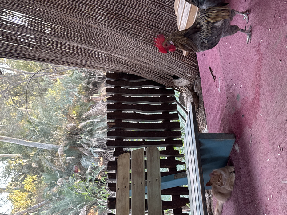 The image displays an outdoor scene located in the Emek HaYarden Regional Council, Israel. In the foreground, a reddish-pink outdoor carpet covers the ground. On the left, a light-colored wooden bench with blue supports is present. An orange tabby cat is observed lying beneath the bench, positioned facing towards the right side of the frame. To the right, a rooster with a prominent red comb and wattles, exhibiting multi-colored plumage of brown, grey, and black, stands upright on the carpet, facing left towards the cat and bench. Behind the bench and animals, a dark brown wooden fence constructed from irregularly shaped vertical slats is visible. To the right of the fence, a woven natural fiber screen stands vertically. The background features dense, lush vegetation consisting of tall trees with light-colored trunks and numerous palm-like plants. Small white fragments are scattered across the reddish-pink carpet. Natural daylight illuminates the scene.