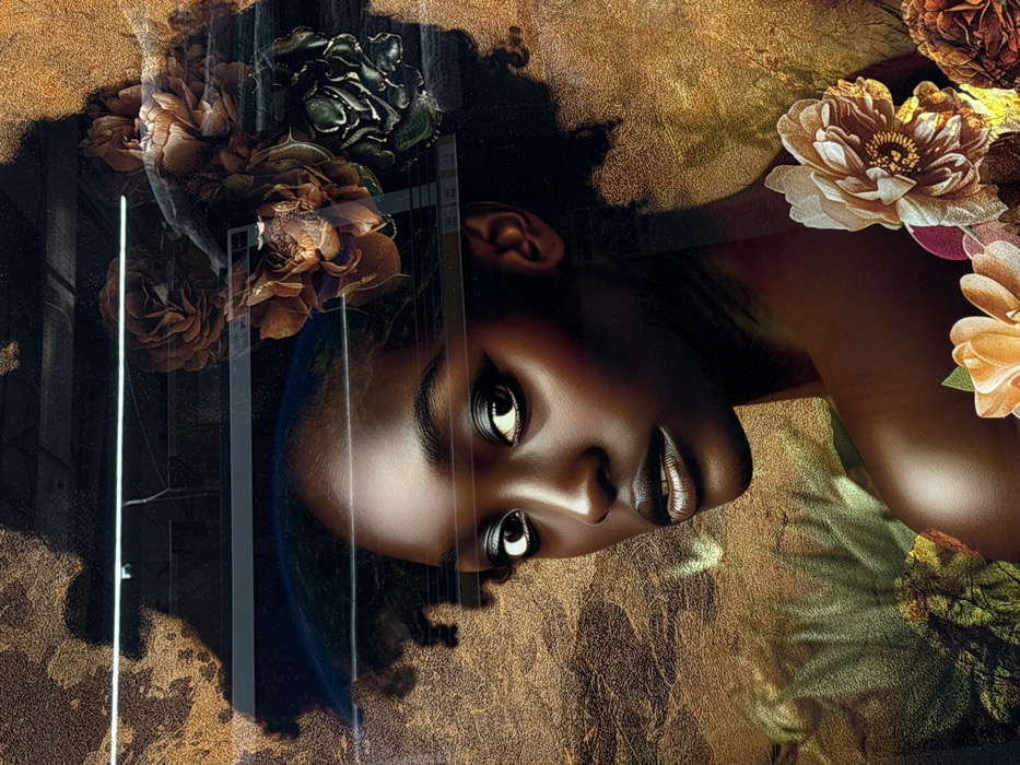 This image is a composite artwork, located within the city of Tbilisi, Georgia, depicting a female individual in a stylized portrait. The subject, a woman with dark skin and voluminous dark curly hair, is positioned facing slightly right, looking directly forward towards the viewer over her right shoulder. She features prominent cheekbones, full lips with a dark, glossy, metallic finish, and eyes accentuated with dark winged eyeliner. Her right shoulder is visible, suggesting a bare or off-the-shoulder presentation. The background consists of a textured, mottled golden-brown surface, overlaid with various botanical elements including large, multi-petaled flowers in shades of orange, brown, and muted green. Superimposed across the entire scene is a reflective or transparent layer displaying horizontal lines and elements of an interior environment, including a bright horizontal light strip near the top. Within the upper portion of the subject's hair, a curved blue and white segment, resembling the Earth, is visible, along with clusters of dark, textured flowers. The scene is illuminated to highlight the subject's features and the metallic tones in the composition. The individual is static, posing without depicted actions or interactions with others.