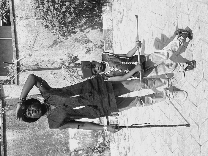 The scene depicts two individuals, an adult male and a young boy, posing outdoors in Sabon Tasha, Nigeria