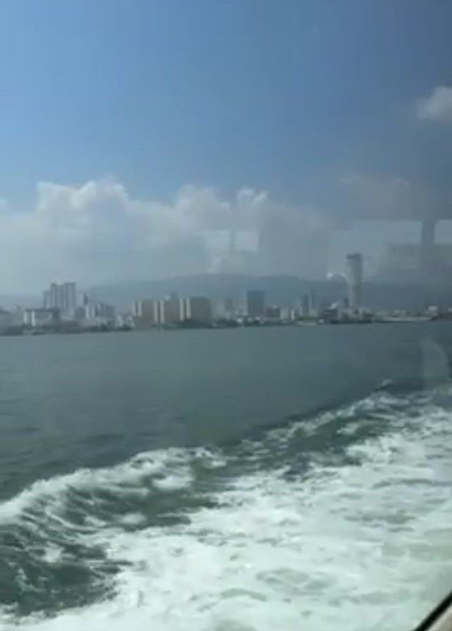 The view from a boat traveling on the water reveals a cityscape in the distance