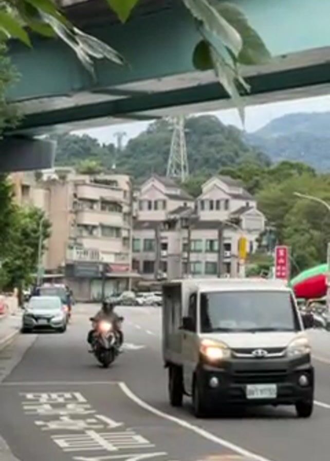 The video depicts a street scene in what appears to be a suburban or urban area of a city with hills in the background. A person on a motorcycle rides towards the camera and then past it. The motorcycle is moving along a road with white lines marking the lanes. Other vehicles, including a van and cars, are also seen on the road. There are buildings on both sides of the road, some of which are multi-story apartment buildings. In the background, there is a hill covered with trees, and a transmission tower can be seen on top of the hill. The video is shot from a slightly elevated position, possibly from a sidewalk, and some tree branches are visible in the foreground.