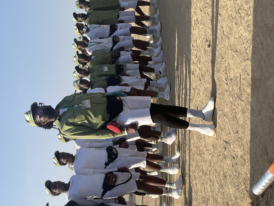 A line of people stand on a sandy surface under a blue sky, likely outdoors. They are dressed in similar clothing, mainly white and green, including hats and uniforms. One individual stands out with black leggings under white shorts. Their shadows stretch across the ground, indicating a strong light source. The setting might be a military or formal gathering.