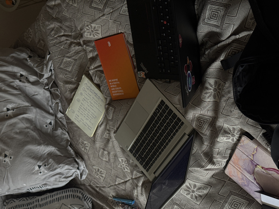The image displays an overhead view of a bed, presumably in an indoor setting. The specific city of Bad Nauheim, Germany, is not visually discernible from the image content. The bed is covered with a patterned duvet featuring repeating geometric and stylized floral motifs in shades of grey and beige. A grey pillow with abstract animal-like faces is visible in the upper left. Arranged on the duvet are several items: * Two pens or styluses, one blue and one white/transparent, are positioned on the left side. * A silver-colored laptop is open, angled towards the upper left, displaying its keyboard and a dark screen. * A black Lenovo ThinkPad laptop is also open, angled towards the right, showing its keyboard, red trackpoint, and a screen that is partially visible. Several colorful stickers are affixed to its lid or wrist rest area. * A small, open, grid-paper notebook with handwritten text is situated above the laptops, closer to the pillow. * An orange and red gradient-colored book or journal is placed next to the grid-paper notebook. Its cover features white text that reads, "WE INSPIRE IN A DIGITAL WORLD AND CREATE EXCEPTIONAL EXPERIENCES" and a "QD" logo. * A tablet, housed in a marble-patterned (pink, purple, white) case, is partially visible at the bottom left. * A black bag, possibly a backpack or laptop bag, with its opening facing upwards, occupies the bottom right corner of the frame. No people are present in the scene. The items suggest a workspace or study area on the bed.