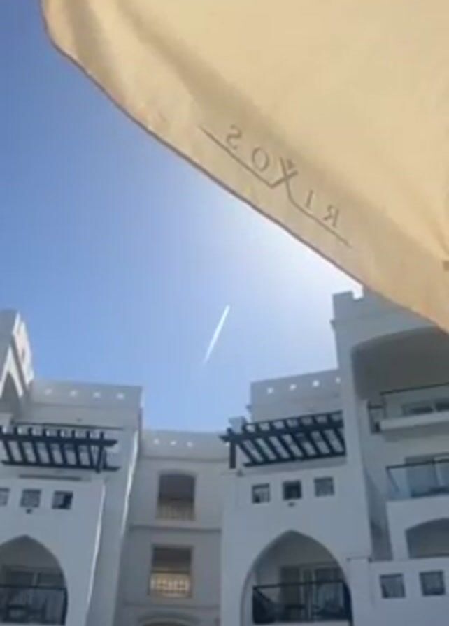 view of a hotel complex against a clear blue sky. The hotel is white with distinct architectural details, including arched balconies and dark wooden pergolas. The camera angle is from below, partially obscured by a beige-colored umbrella bearing the logo "RIXOS" in mirrored text. A contrail from an airplane stretches across the sky, moving away from the camera. The scene is brightly lit by the sun, with a slight glare around the contrail.