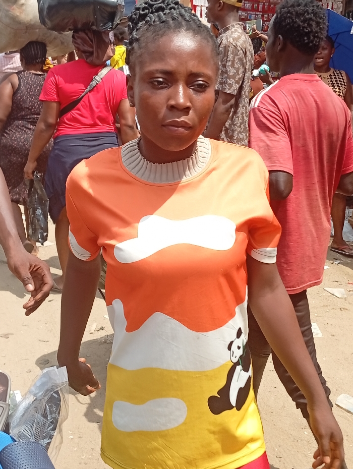 In a bustling outdoor market scene, a young woman with her hair neatly styled is the primary focus. She wears a vibrant, patterned shirt featuring orange, white, and yellow sections with a panda design. The background reveals a crowded marketplace with various vendors, shoppers, and scattered debris. The scene is bathed in bright daylight.