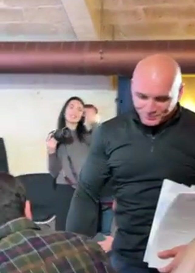 A bald man in a black shirt is standing in the middle of a room with people around him. He's holding papers and looking at someone to his left. People are moving around him. A woman with a camera is standing behind him. The room has a brick ceiling and a metal pipe running across it.