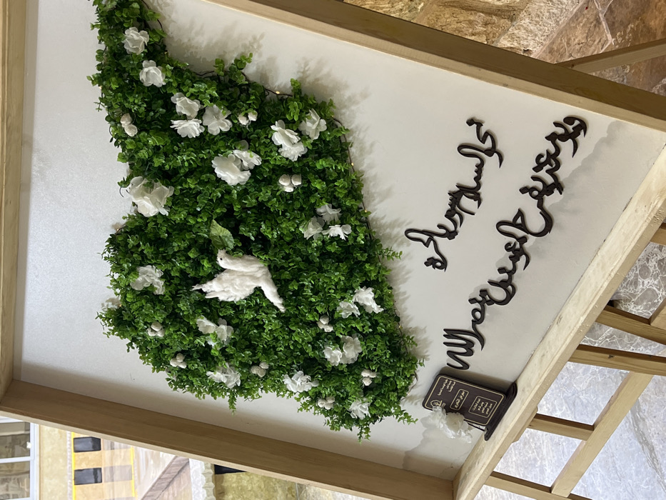 An indoor scene in Idlib, Syria, features a large display board mounted on a wooden easel. The board is framed in light-colored wood and has a white background. The upper section of the board presents a three-dimensional map of Syria, crafted from dense artificial green foliage, interspersed with numerous white artificial flowers and small white berries. A white, plush-like figure of a dove, holding an artificial green leaf in its beak, is affixed to the map in the central-left region. Subtle string lights are woven into the foliage. Below the map, three lines of dark, laser-cut Arabic text are adhered to the white surface. The text reads: "نحن سلام سوريا حرة" (We are the peace of Free Syria), "وما عن عرينها ما اتغير" (And from its den, it has not changed), and "بإذن الله" (By the will of Allah). To the left of this text, a smaller, dark brown rectangular plaque with white Arabic text stands upright on a dark base. A small white flower is attached to the plaque's side. The plaque's text reads: "الإدارة العامة للخدمات" (The General Directorate of Services) and "مركز التحرير" (The Liberation Center/Headquarters). The background to the left of the display board reveals a partial view of an exterior building with light-colored walls and dark window openings, possibly seen through an internal opening or window. To the right, a textured wall constructed of warm-toned stone or brick is visible. No individuals are present in the scene.